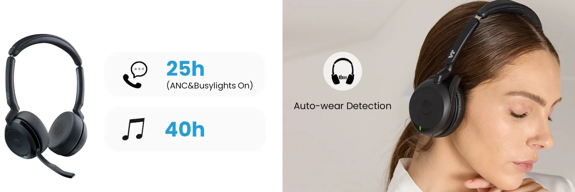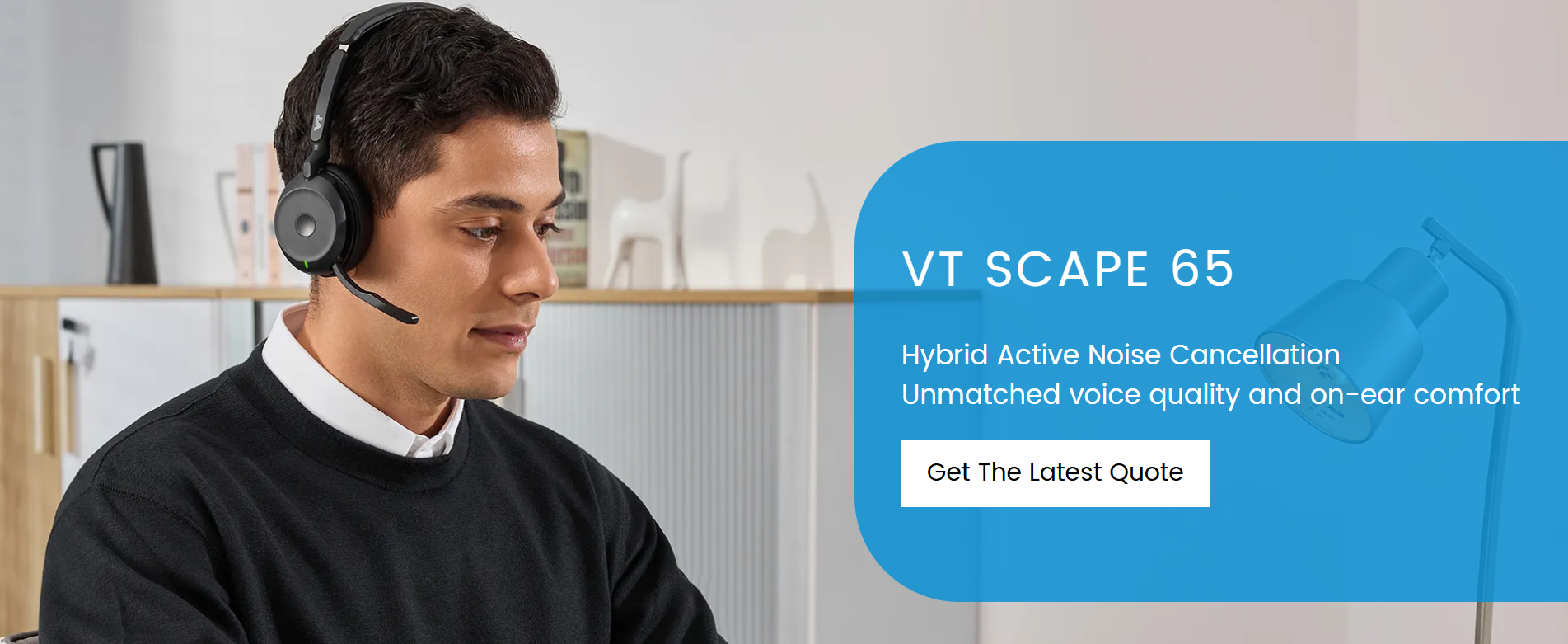 The VT SCAPE 65 is a professional, portable, and wireless headset, featuring Hybrid Active Noise Cancellation (ANC), 6-mic voice technology, and up to 25 hours of talk time, designed for focus and productivity. It is a reliable, long-range (30m) solution for office or remote work.